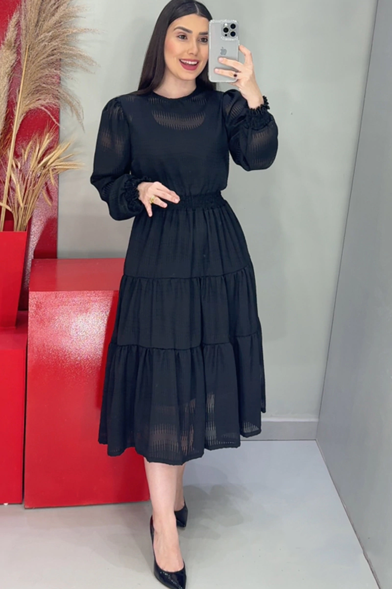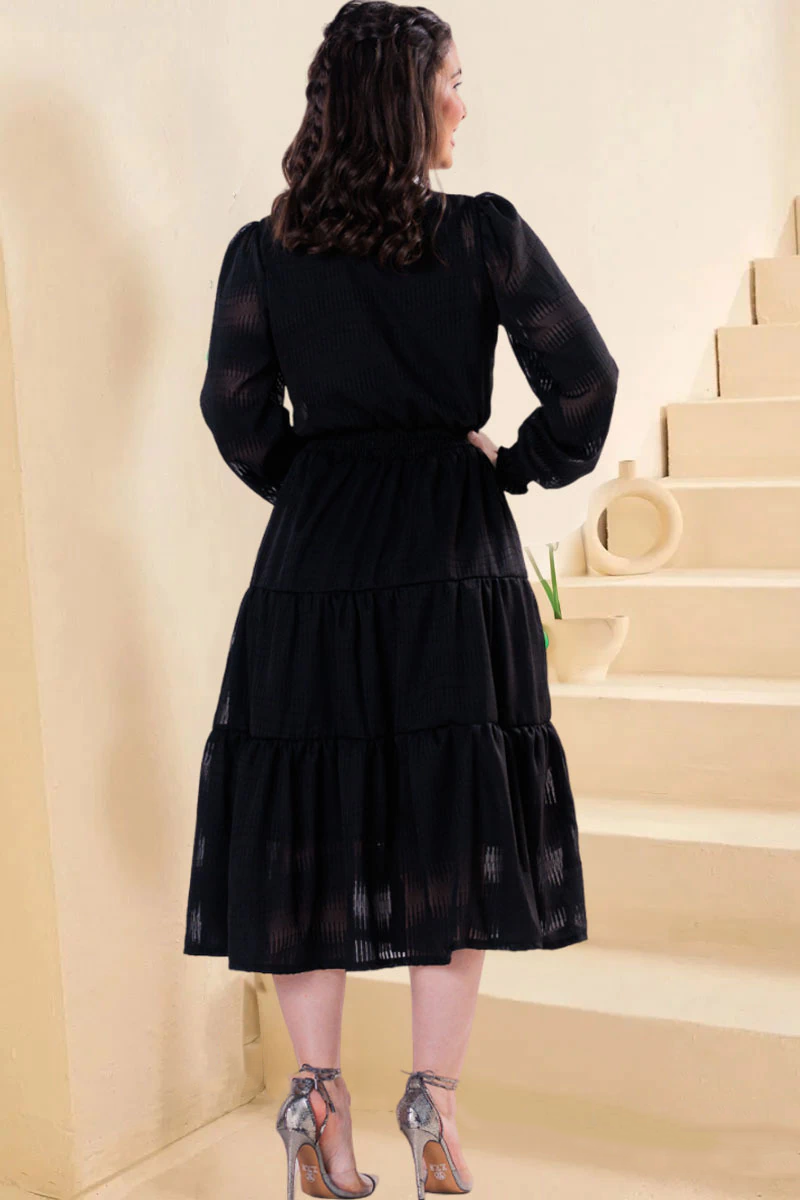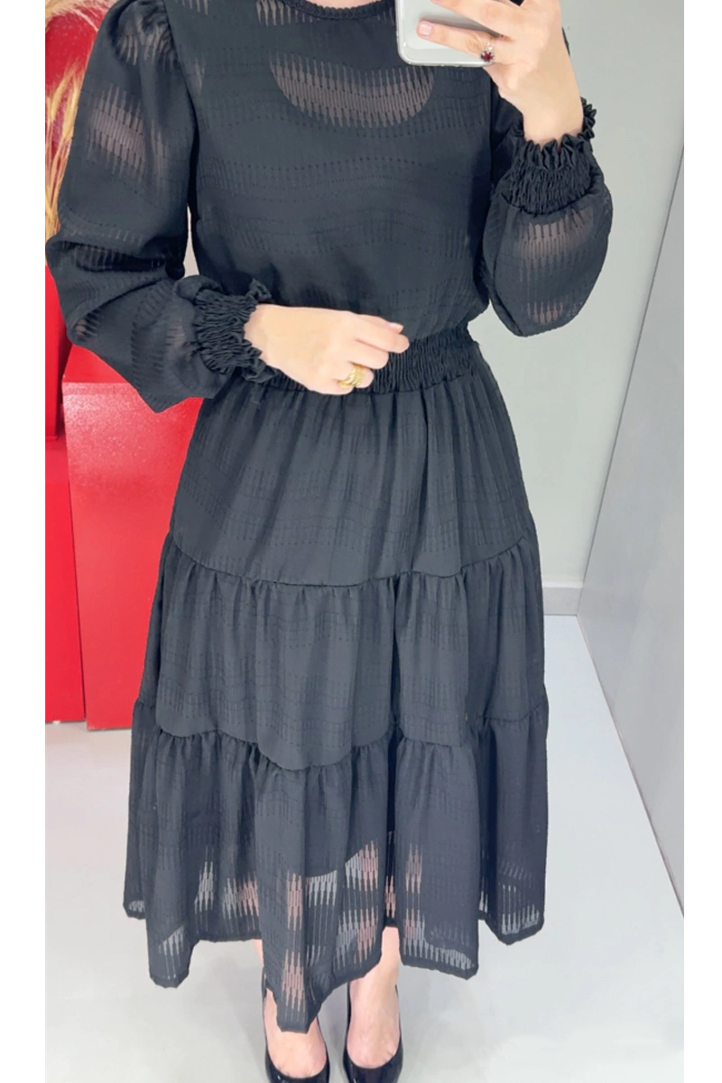 Black dress with intricate fabric Guipir details on the collar